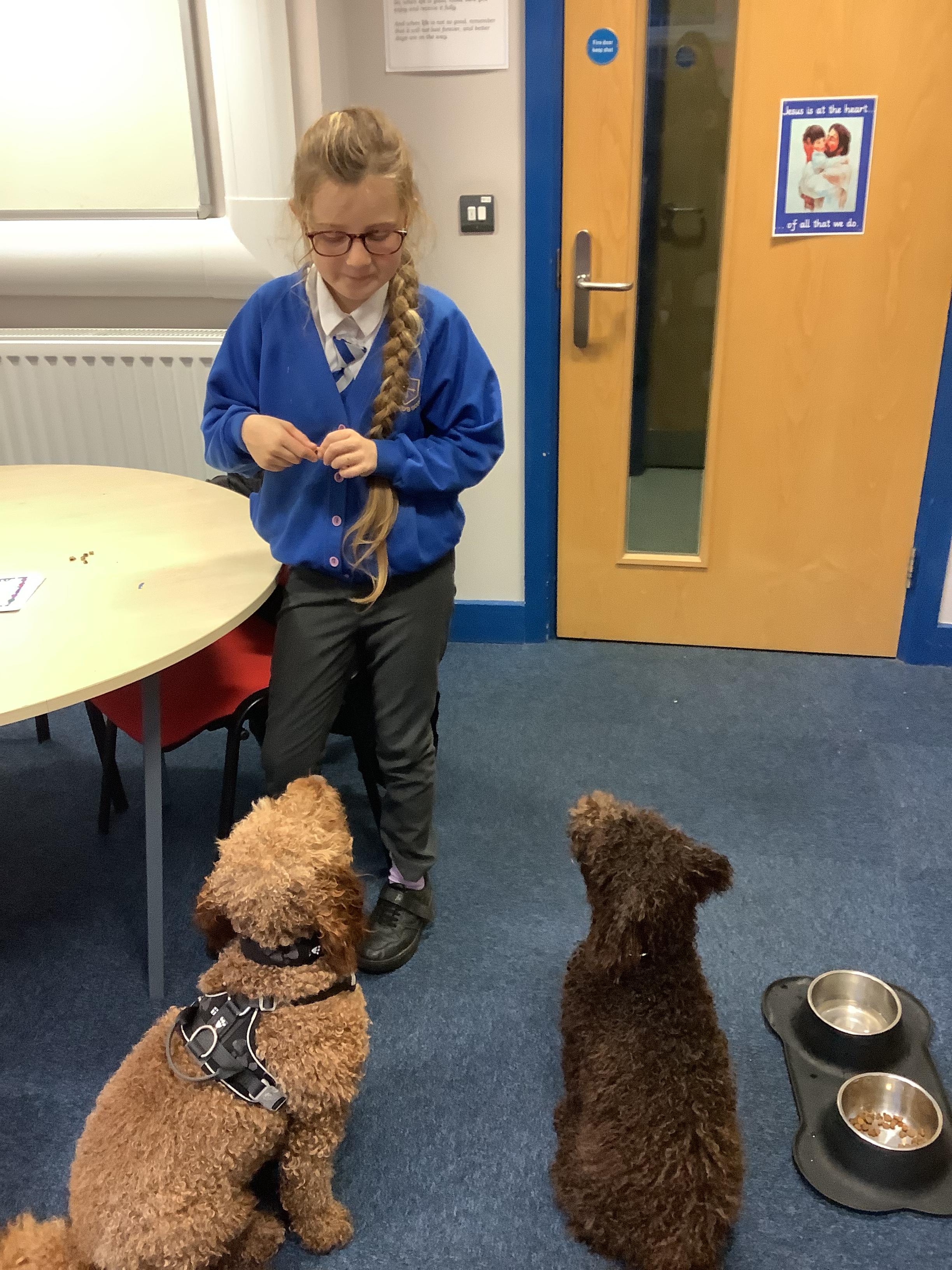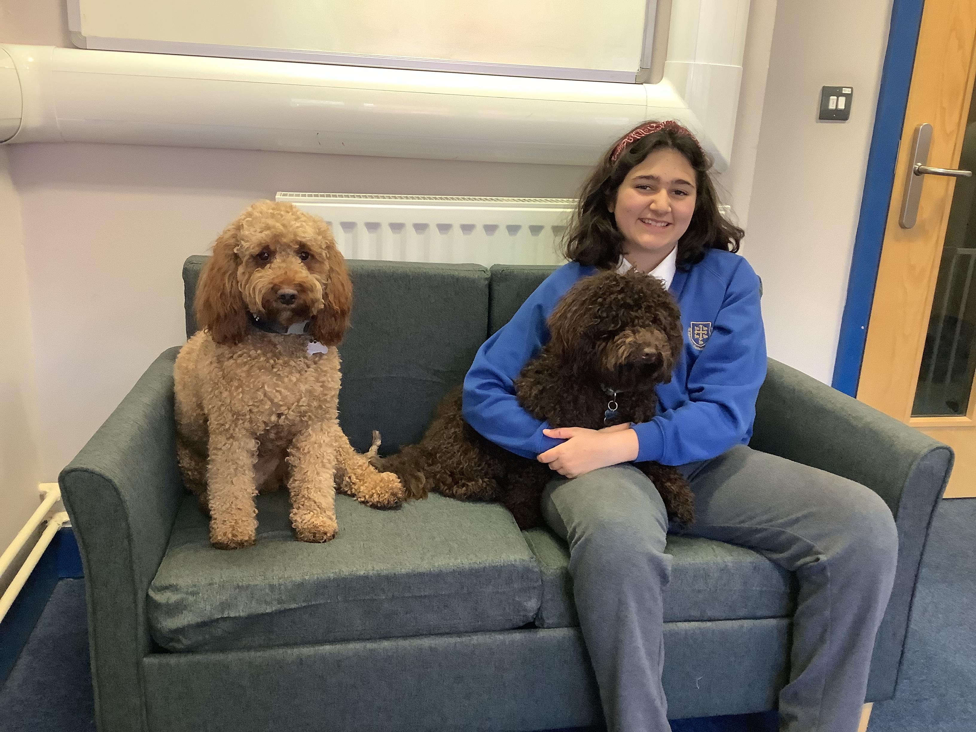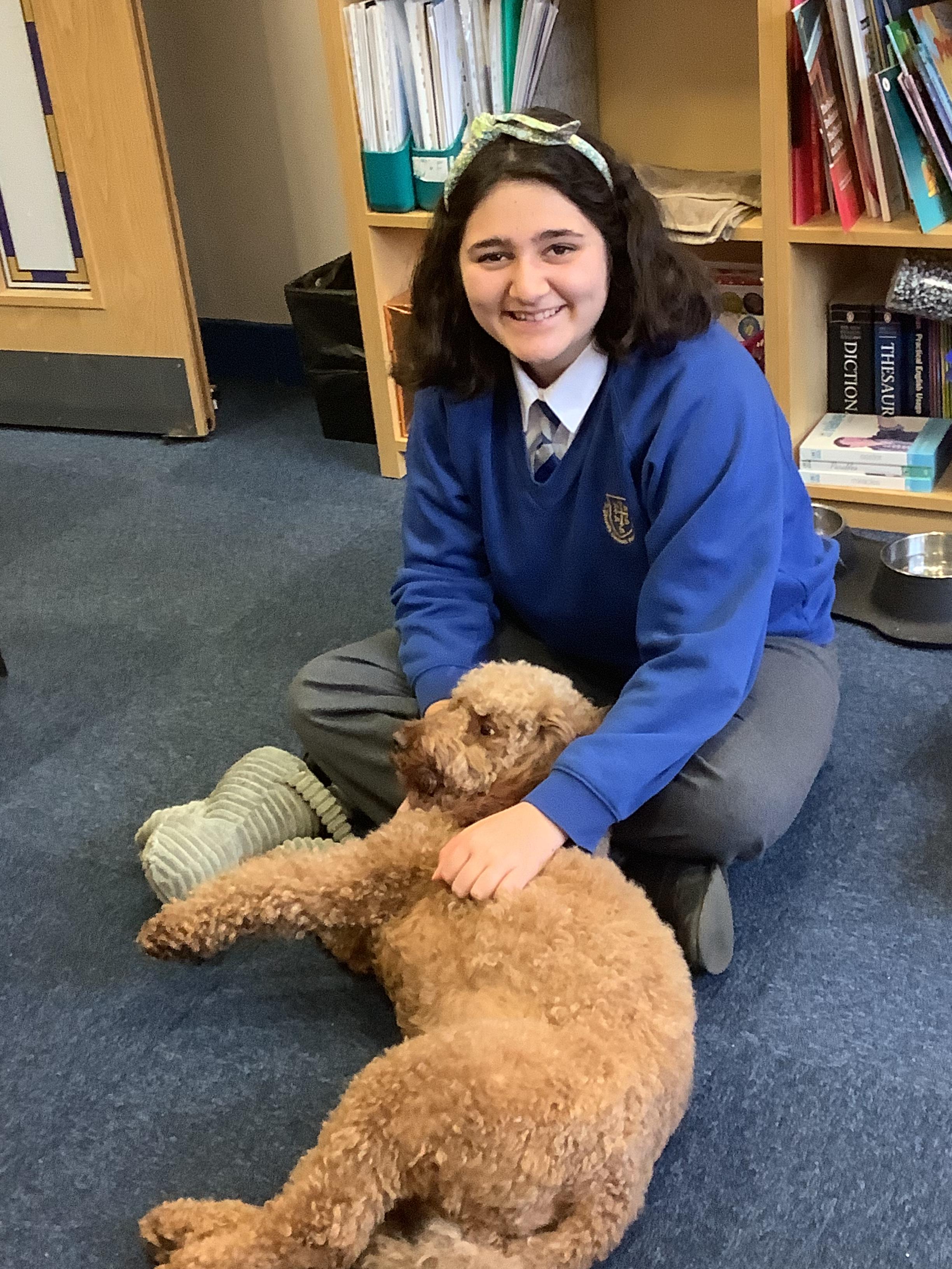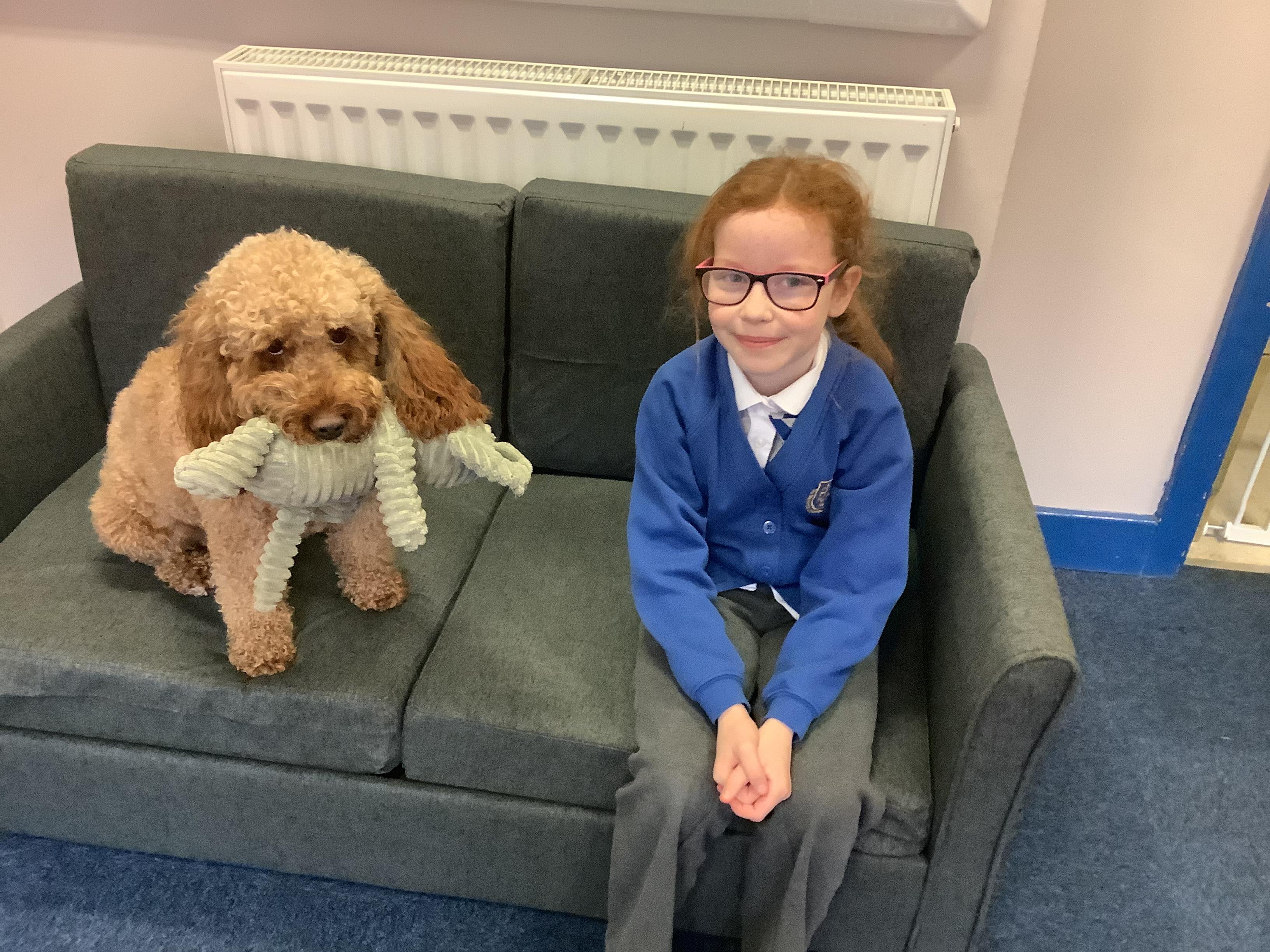 Millie is officially our St Edward's school dog. We love her! She is a Sproodle who belongs to Mrs Kennett, our Head Teacher and her family but during the day we all get to see her, talk to her and stroke her if we are allowed. Miss Atkins is the specially trained Teaching Assistant who looks after Millie during the day to make sure that she is working and also resting.