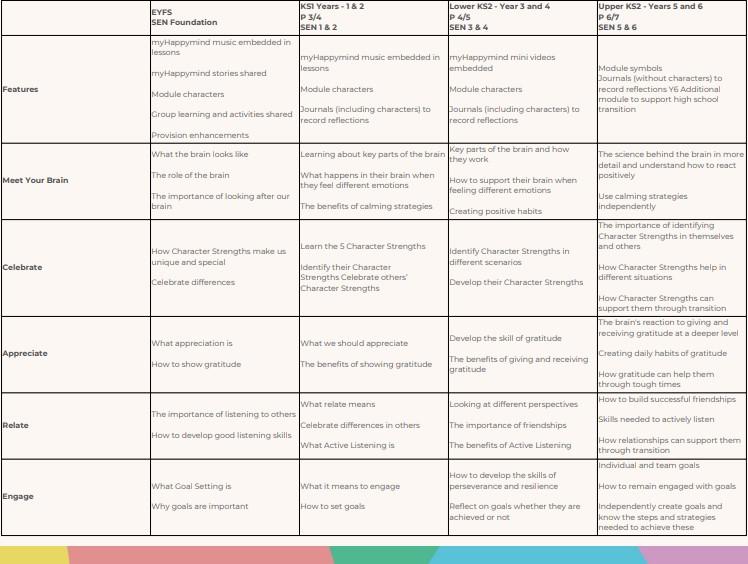 This PSHE curriculum is grounded in the latest science and research about what it takes to create positive wellbeing for pupils from EYFS to Year 6. Myhappymind is taught across five modules and each introduces a new set of content and habits to help children build resilience, self-esteem and confidence. They include; Meet your brain, celebrate, appreciate, relate and engage.  As this is our second year, we will be building on these skills and learn about a new chapter called My Happy Place.