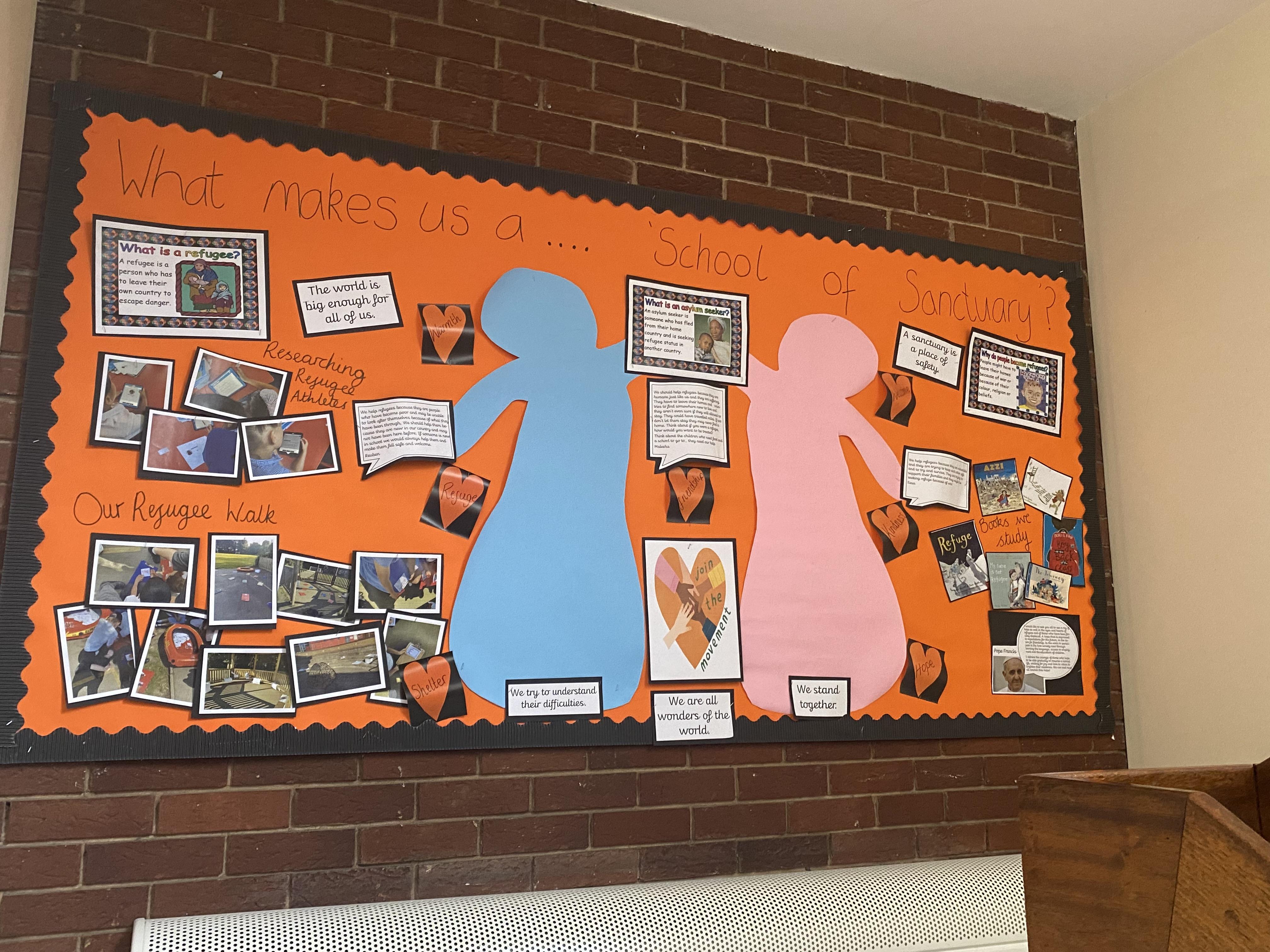 A significant symbol is the orange heart. Each class has an orange heart displayed in their classroom that all of the children have signed to say that they want to support refugees and peace in the world.