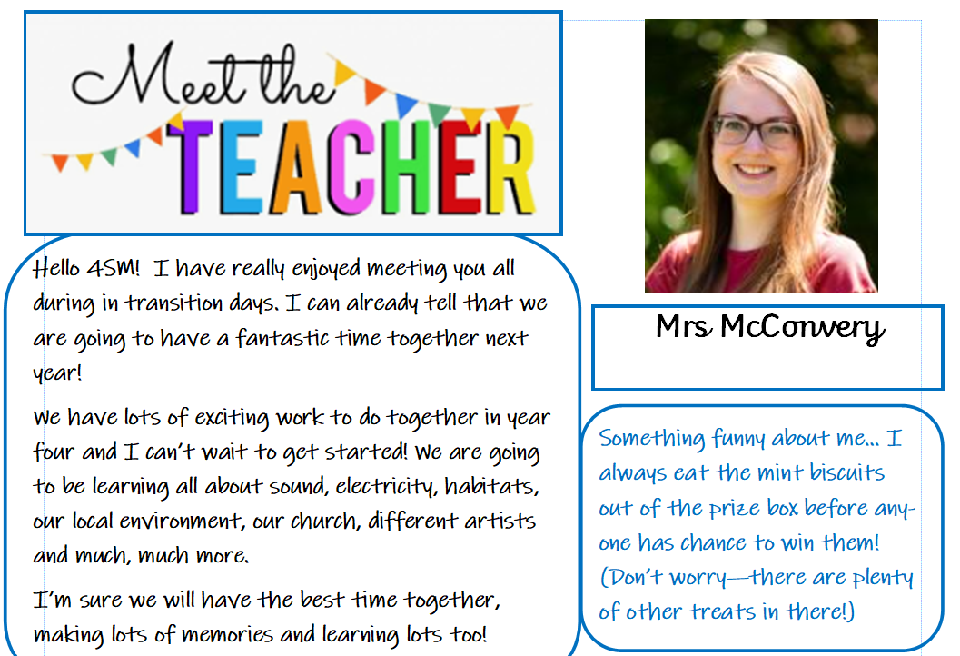 Welcome to a new school year. We're so excited to get to know you and your children. We want you to know that we are always here to help and listen if you ever need us. Mrs. Hill will be the teacher for 4DH and Mrs. Mc Convery will be the teacher for 4SM.